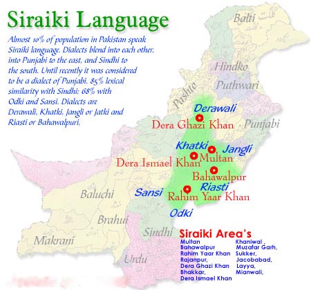 Seraiki is related to Punjabi and Sindhi and it is spoken by 11% of Pakistanis, mostly in southern districts of Punjab as a mother tongue. Dialects tend to blend into each other, into Punjabi to the east, and Sindhi to the south. Seraiki has 85% lexical similarity with Sindhi; 68% with Odki and Sansi. Dialects are Derawali, Thalochi, Khatki, Jangli or Jatki and Riasti or Bahawalpuri.